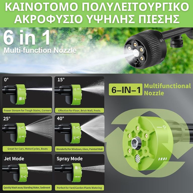 Επίλεξε εσύ την ισχύ και την πίεση ανάλογα με την επιφάνεια που πρέπει να καθαρίσεις. Μπορείς να έχεις έναν εξαιρετικά ισχυρό πίδακα λίγων χιλιοστών ή έναν πίδακα νερού με πλάτος έως 40 μοίρες, ιδανικό για τον καθαρισμό μεγαλύτερων επιφανειών. Όλα ρυθμίζονται απλά περιστρέφοντας το πολυλειτουργικό ακροφύσιο μέχρι να επιλέξεις τη ροή που επιθυμείς.